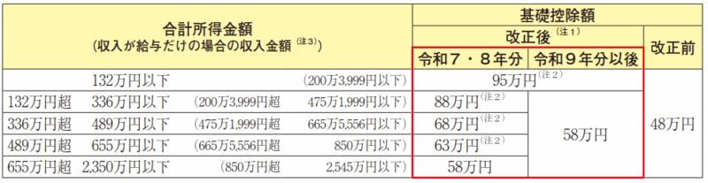 基礎控除はこの2年だけ所得に応じて調整されていますが、令和9年からは合計所得が132万円超になると一律58万円です。